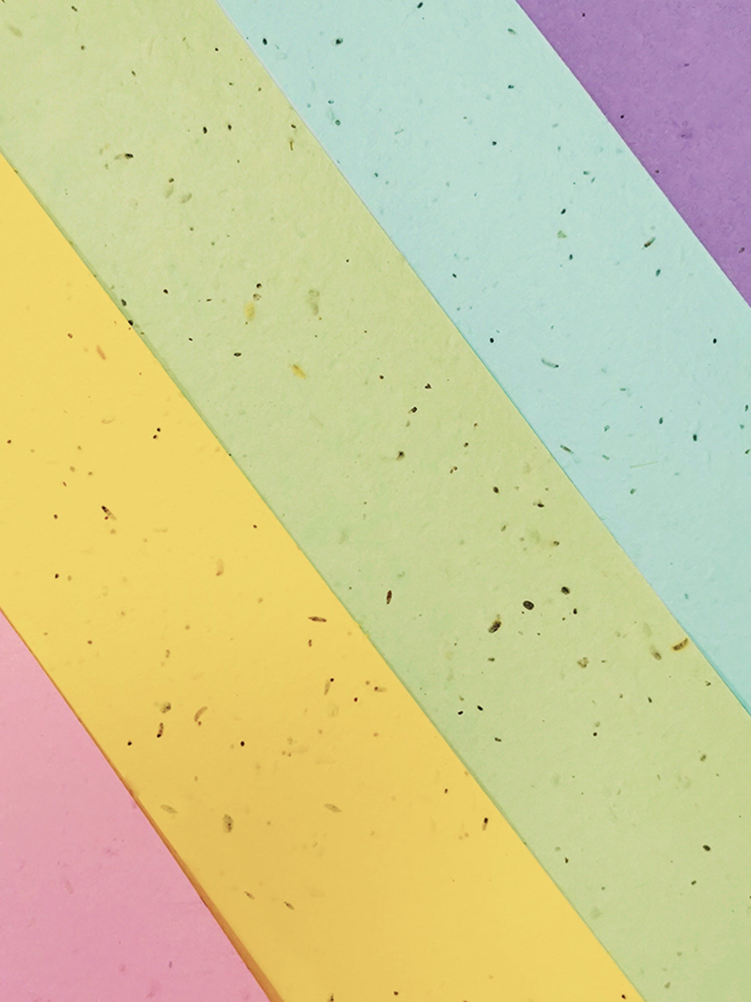 Rainbowseed paper is available in a range of colours. It shares many of the same qualities as our Bloom paper but comes with the added bonus of being avaiable in a range of vibrant colours. Seed option is Wildflower mix (varies by batch but can include poppy, daisy, forget me not, babys breath).