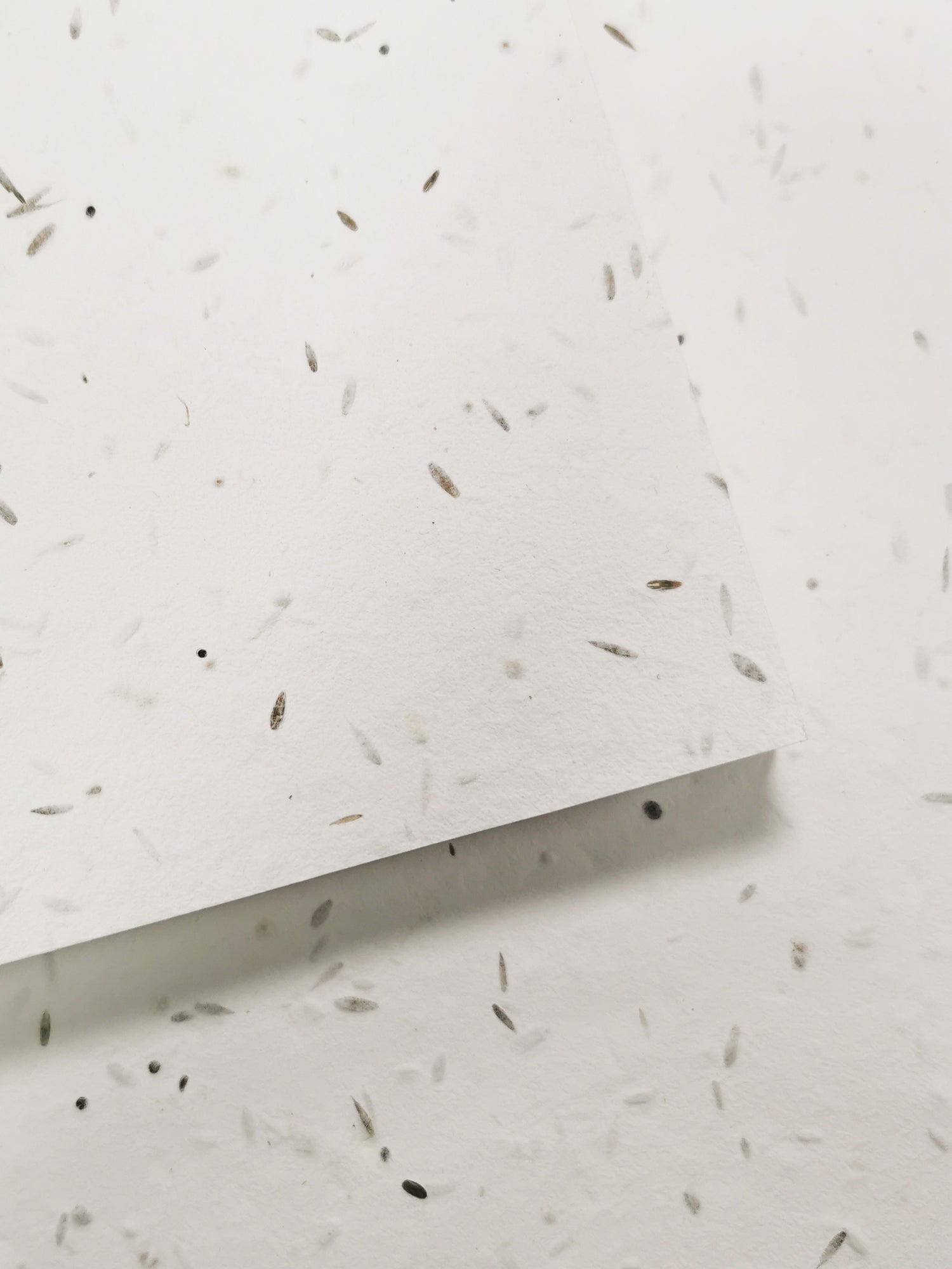 Lux seed paper comes in 130gsm and 200gsm and has an off-white, almost ivory colour. It has a lower growth success rate as it is machine finished but it's strength lies within the great quality and beautiful texture and finish. We use the 200gsm variety for all printed material. Seed options: 200gsm - Wildflower mix (poppy, daisy, rudbeckia and forget me not), Poppy, Daisy, Rudbeckia and Lavender. 130gsm - Wildflower mix.