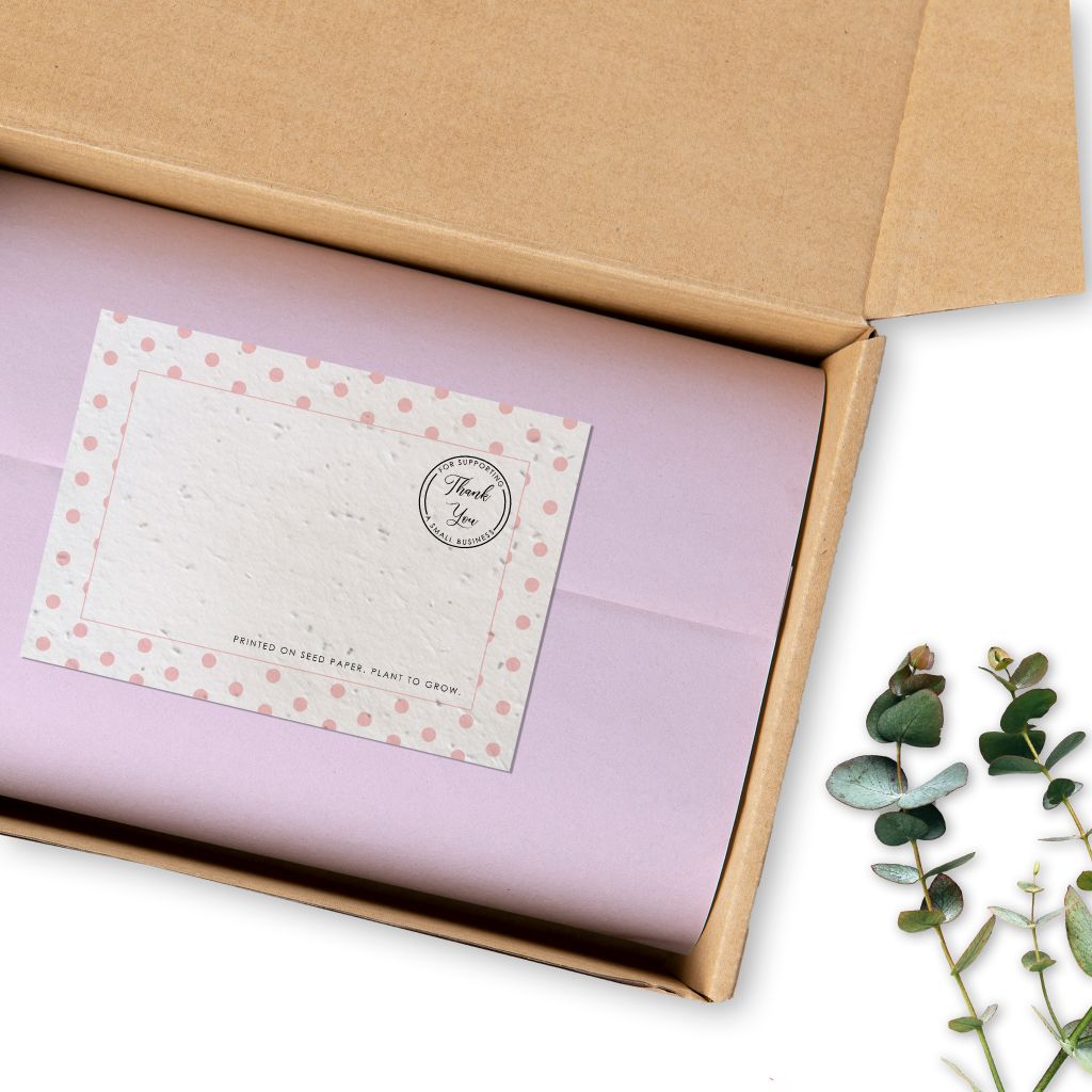 Send a thankyou to show your appreciation for supporting your business with our compliment slips in our Dotty Border - Thankyou Small Business design, printed on one of our eco-friendly papers and help promote sustainability.