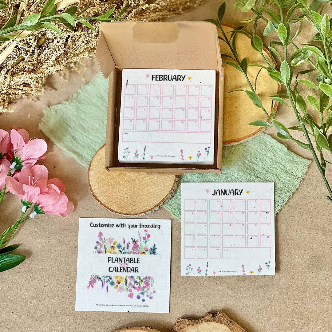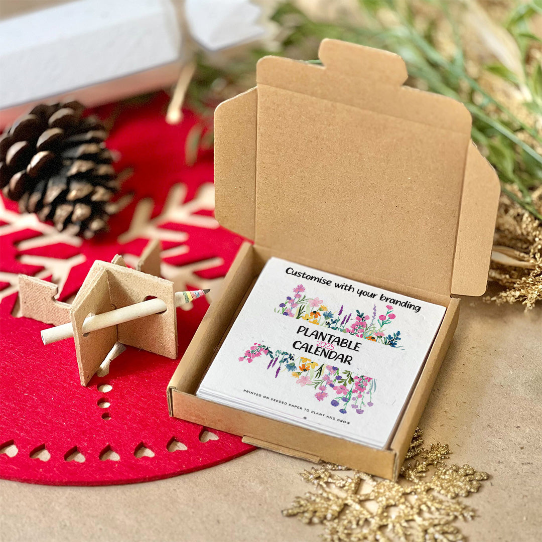 Inspire others to live sustainably with our plantable seed paper desktop calendar. After use, simply plant the pages and watch your reminders grow! Complete with a cardboard stand and pencil and packed individually in an eco-friendly cardboard box, this calendar will keep you organized and eco-friendly all year long.