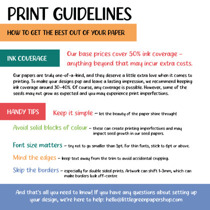 When printing on Seed Paper there is a lot to consider. We recommend using low ink designs and avoiding block colours or photographs (may incur additional costs). Whilst these do print they are not the best use of the board for many reasons. Firstly, seed paper's best quality is the visual nature and large ink blocks hide this. Secondly, the ink has a negative impact upon the germination process. Finally, due to the uneveness in air dried papers it may not give the best finish.